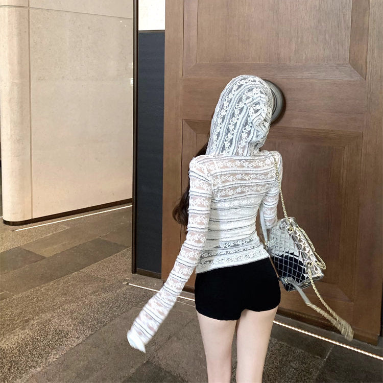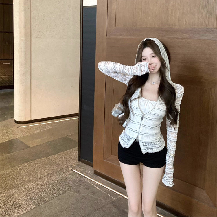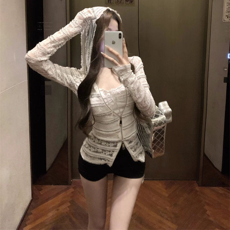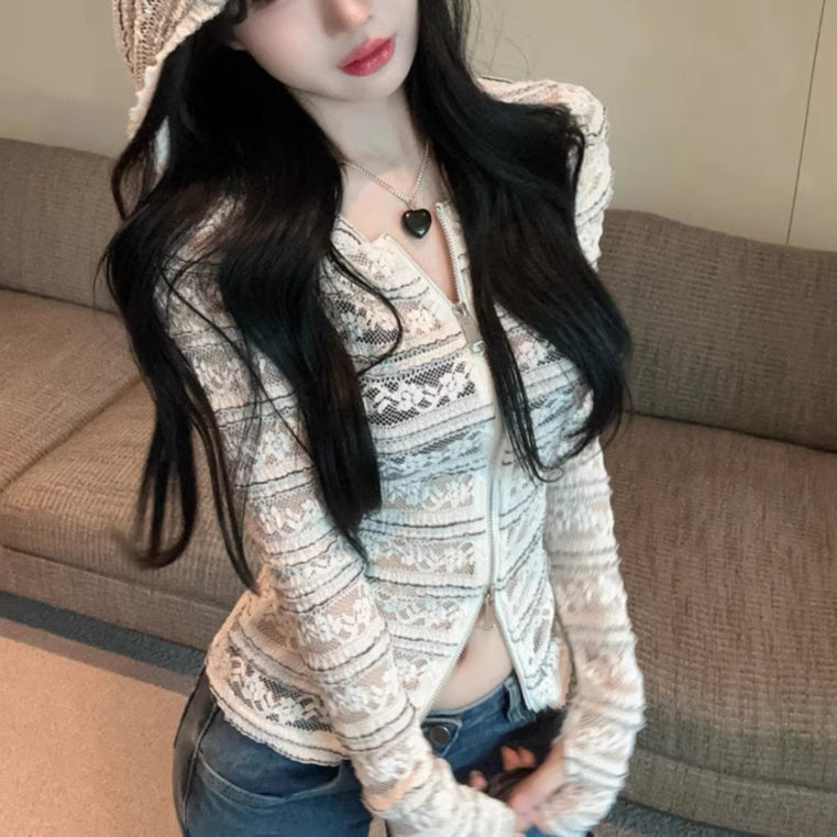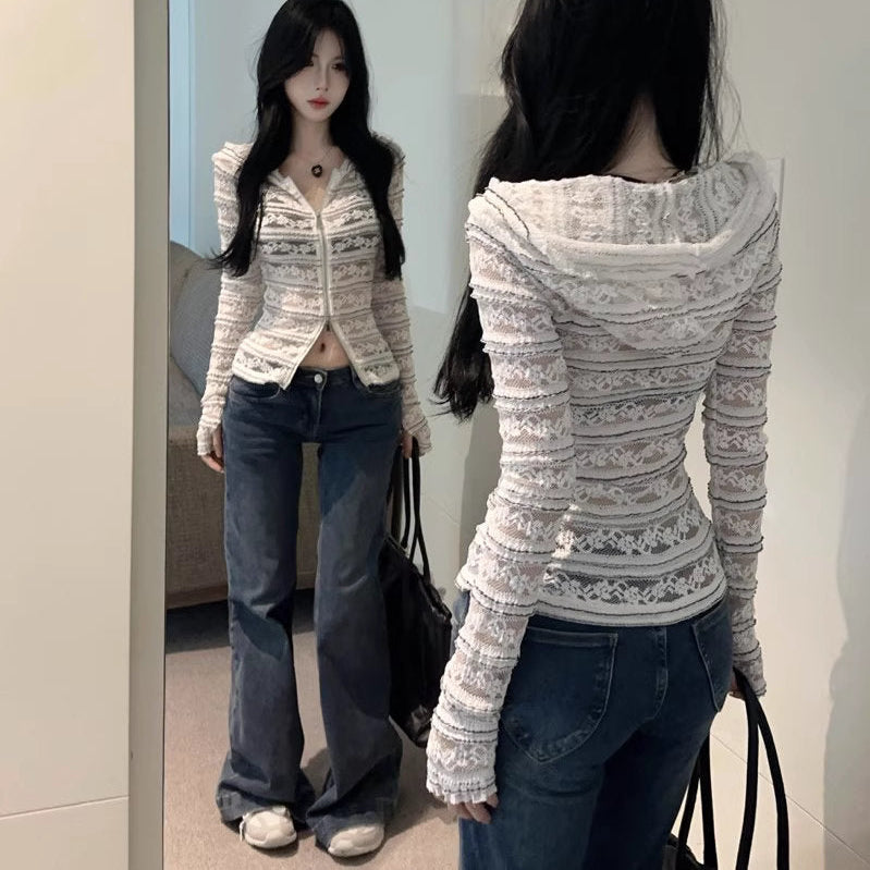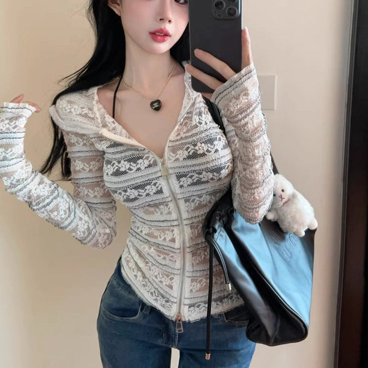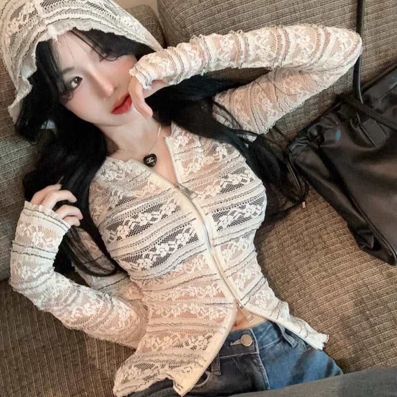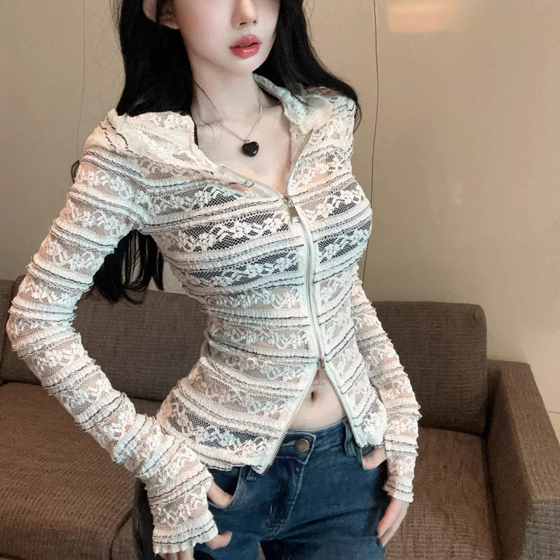 繊細レースが全体を包み込む、フェミニンとモードを掛け合わせたジップアップトップス