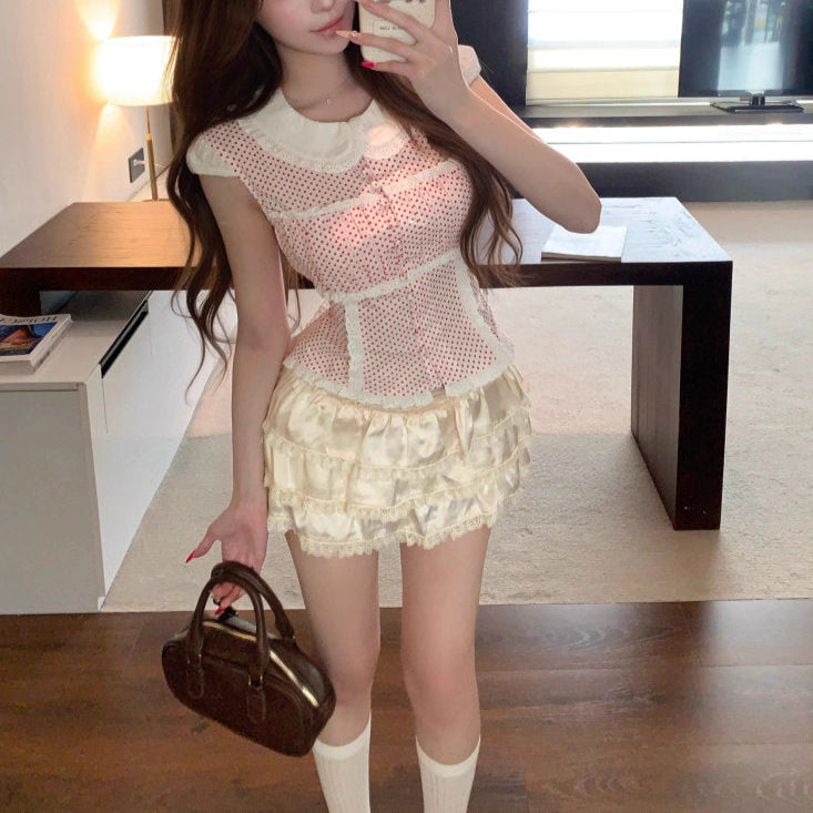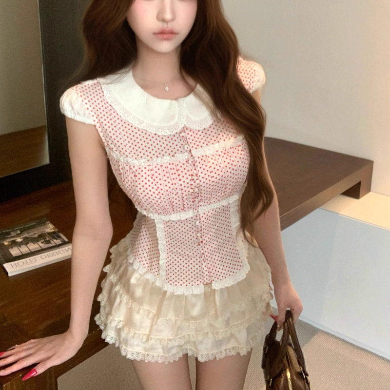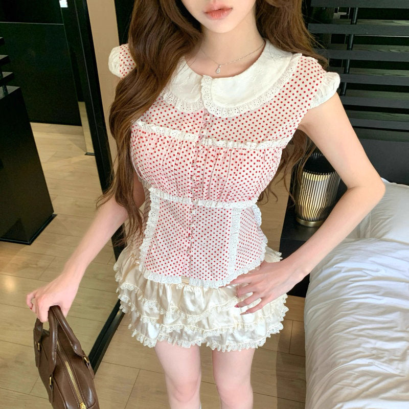 ガーリーなドット柄に、レースと丸襟をあしらった