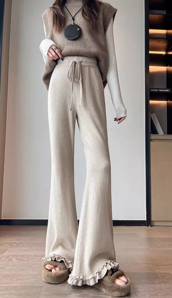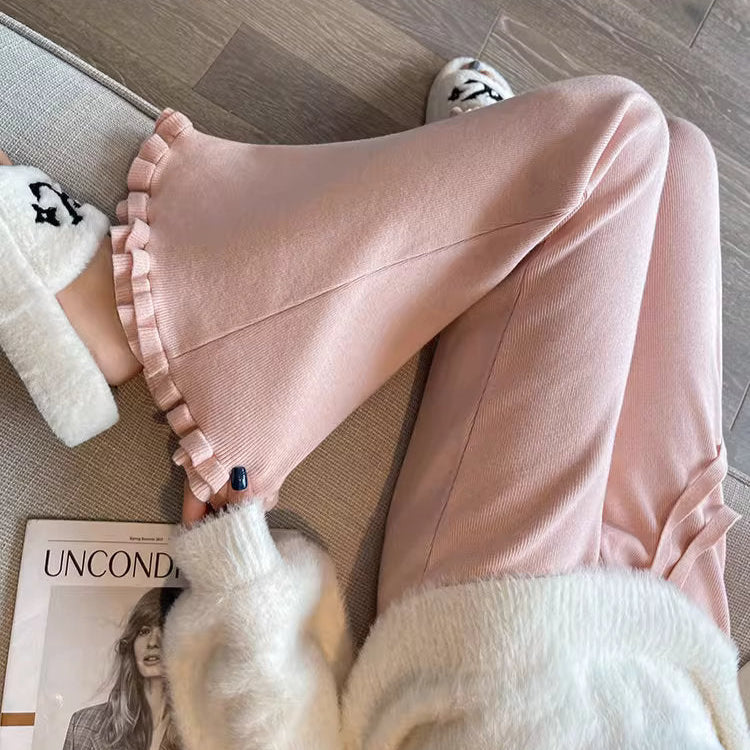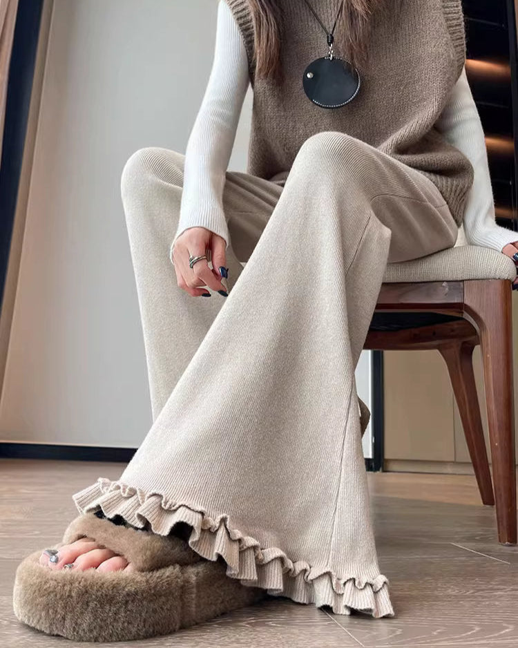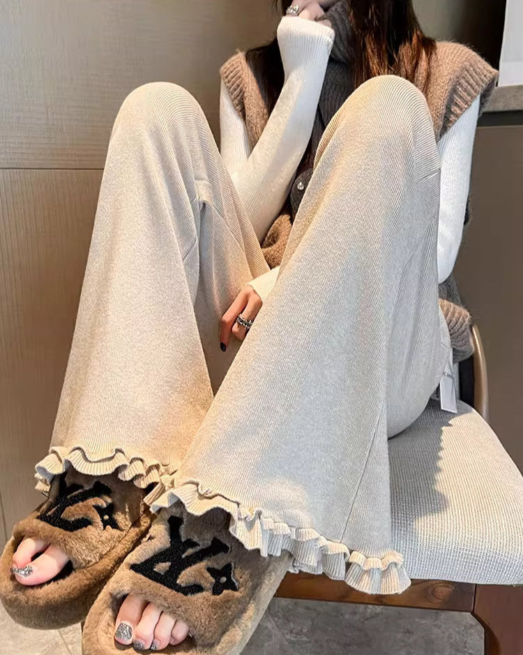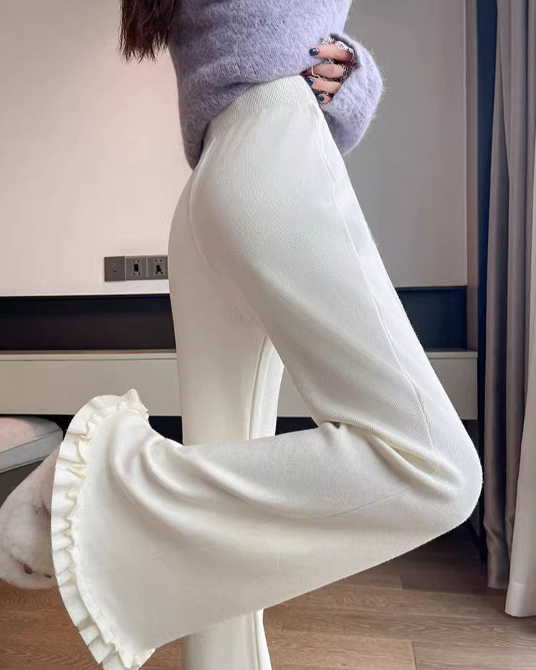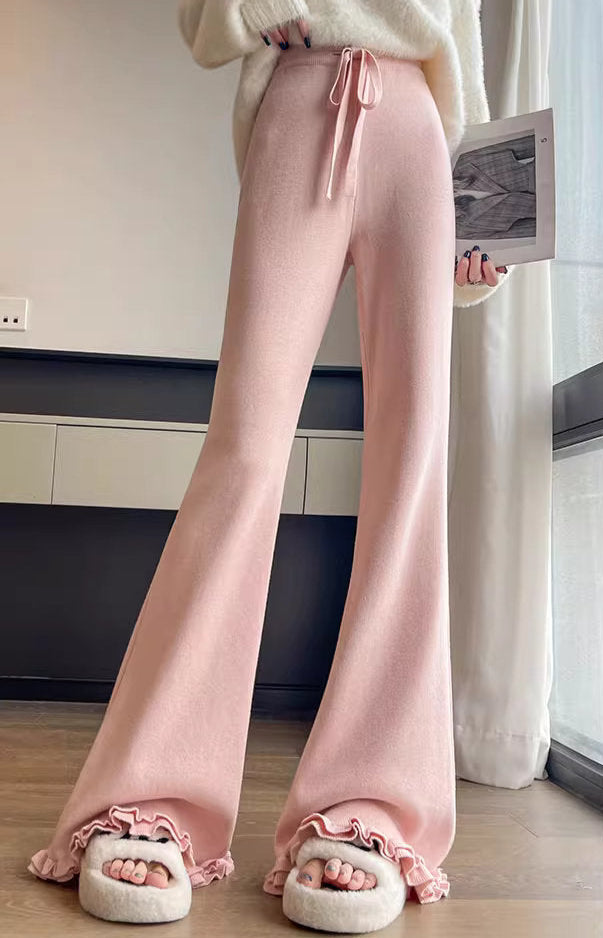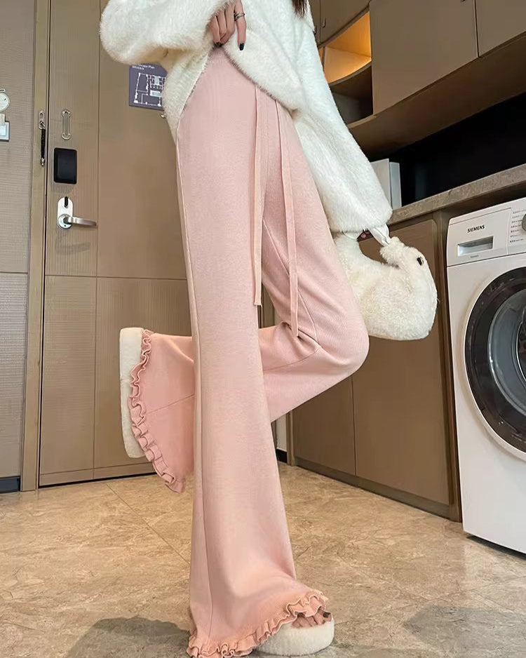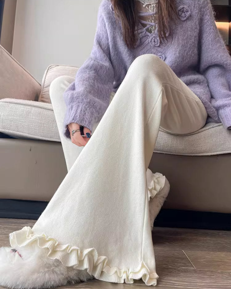 裾のくるんと愛らしいフリルが、歩くたびに揺れて心までときめくニットパンツ♡