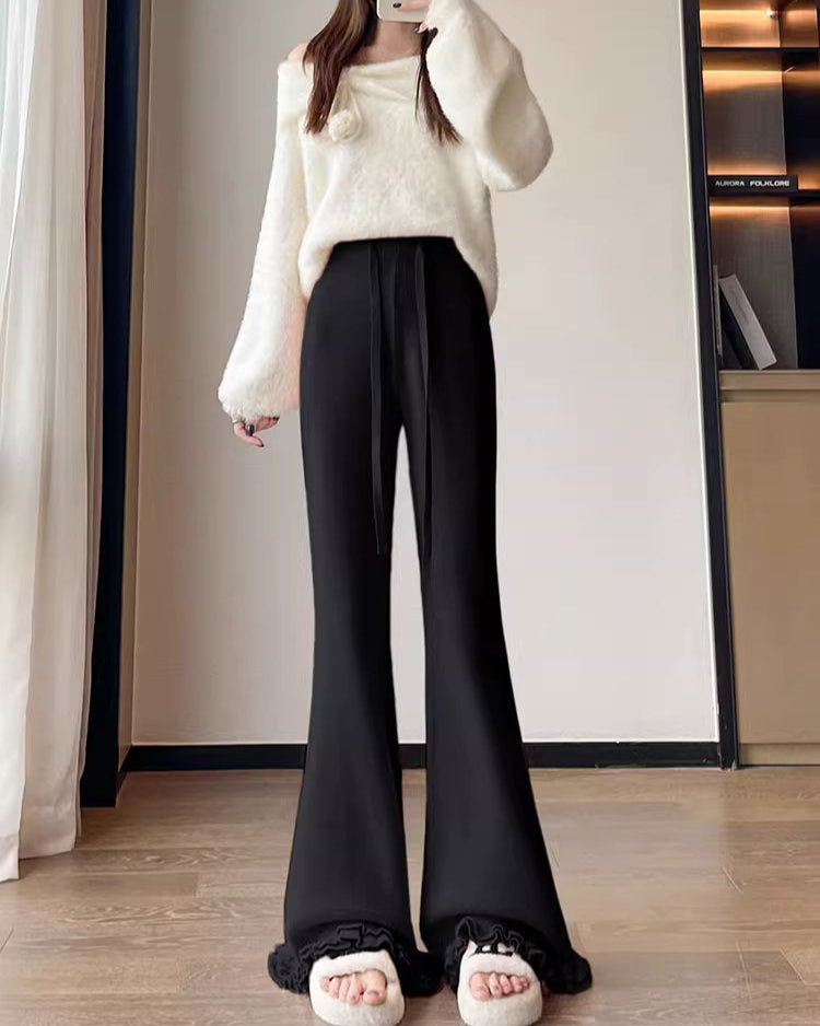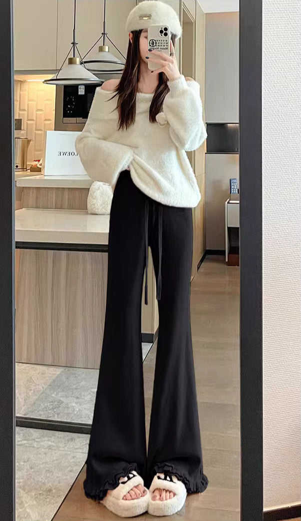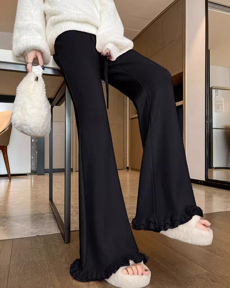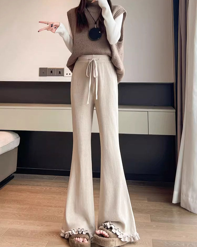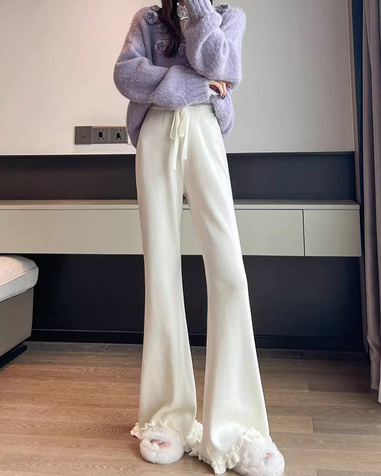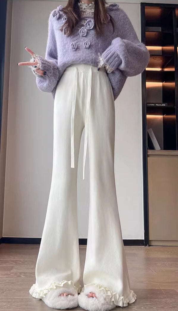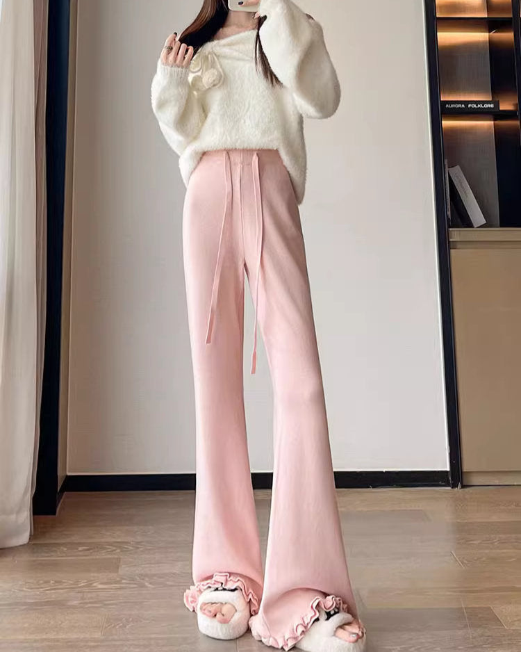 裾のくるんと愛らしいフリルが、歩くたびに揺れて心までときめくニットパンツ♡