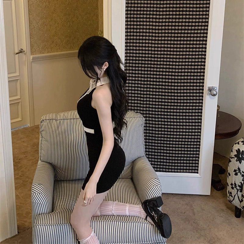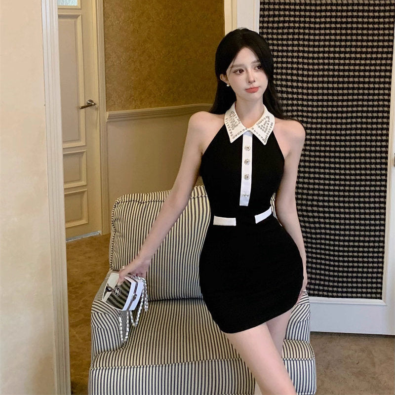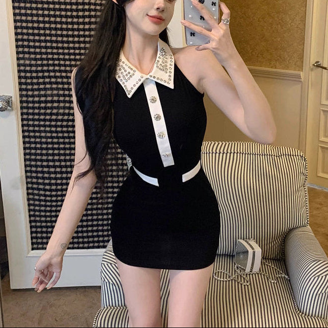 ビジューボタンが連なるフロントデザインに、ホワイトの襟とウエストラインが