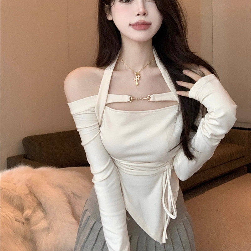 胸元にあしらわれたゴールドパーツと、しなやかに落ちるドレープ。