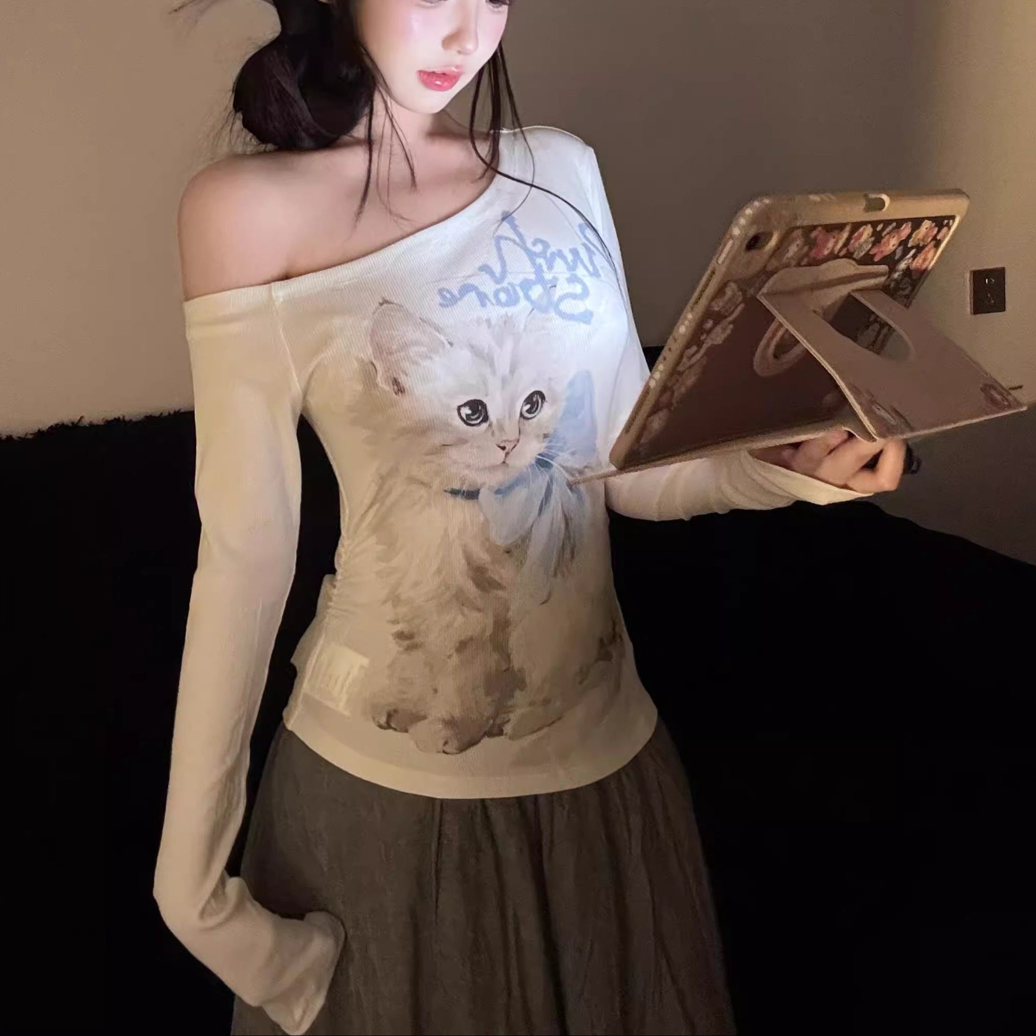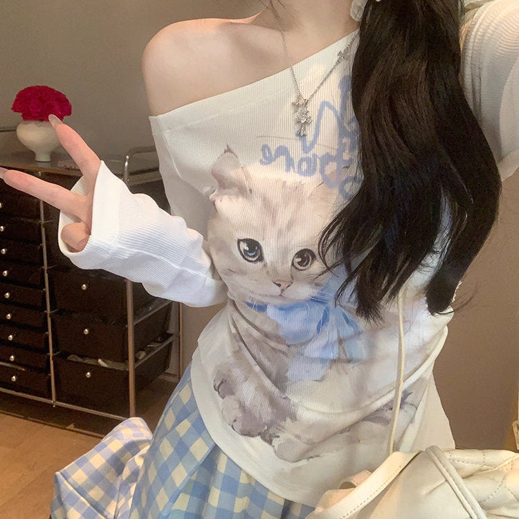 大きな瞳の子猫とリボンのプリントが目を惹く、ガーリーなオフショルトップス♡
