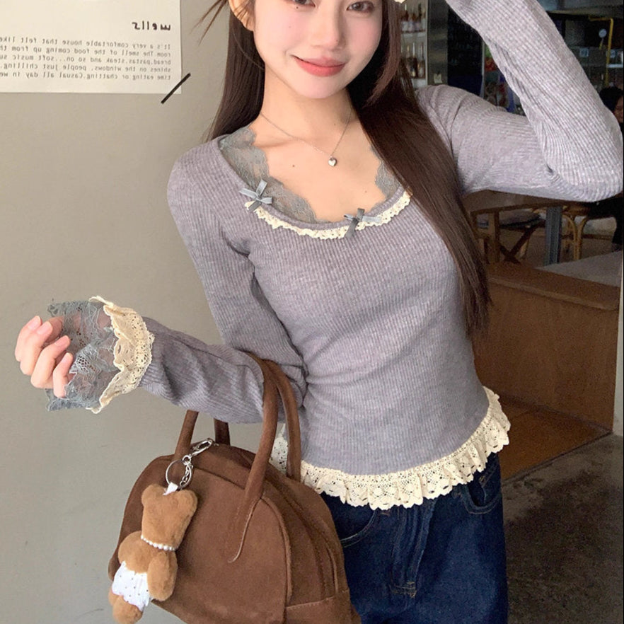 胸元と袖口に施された繊細なレースと小さなリボンが