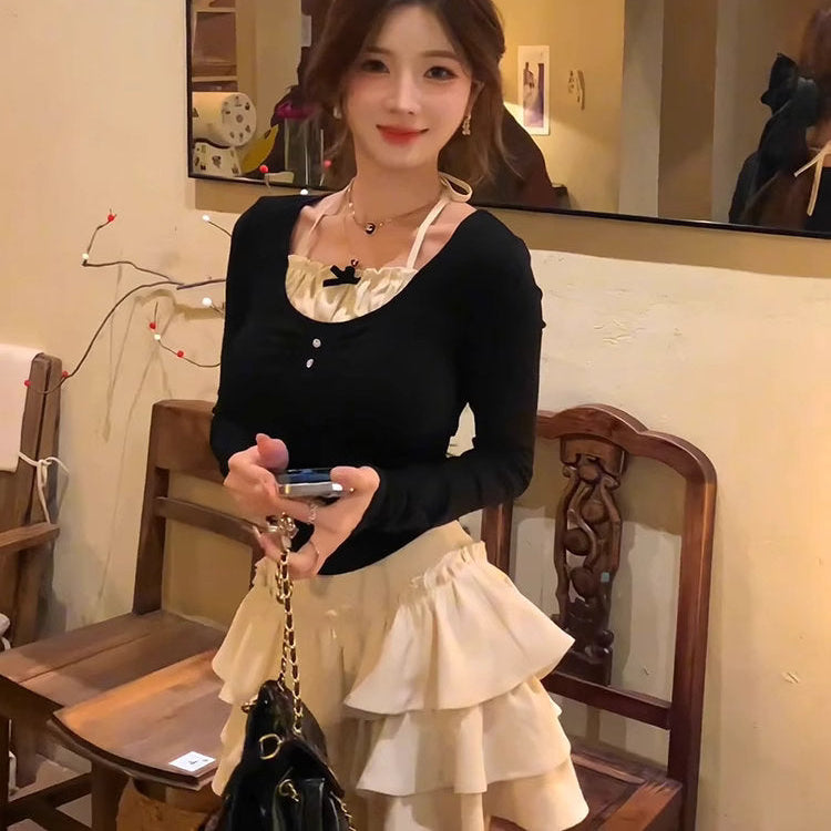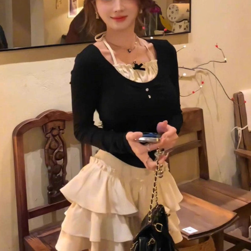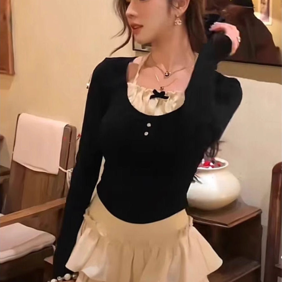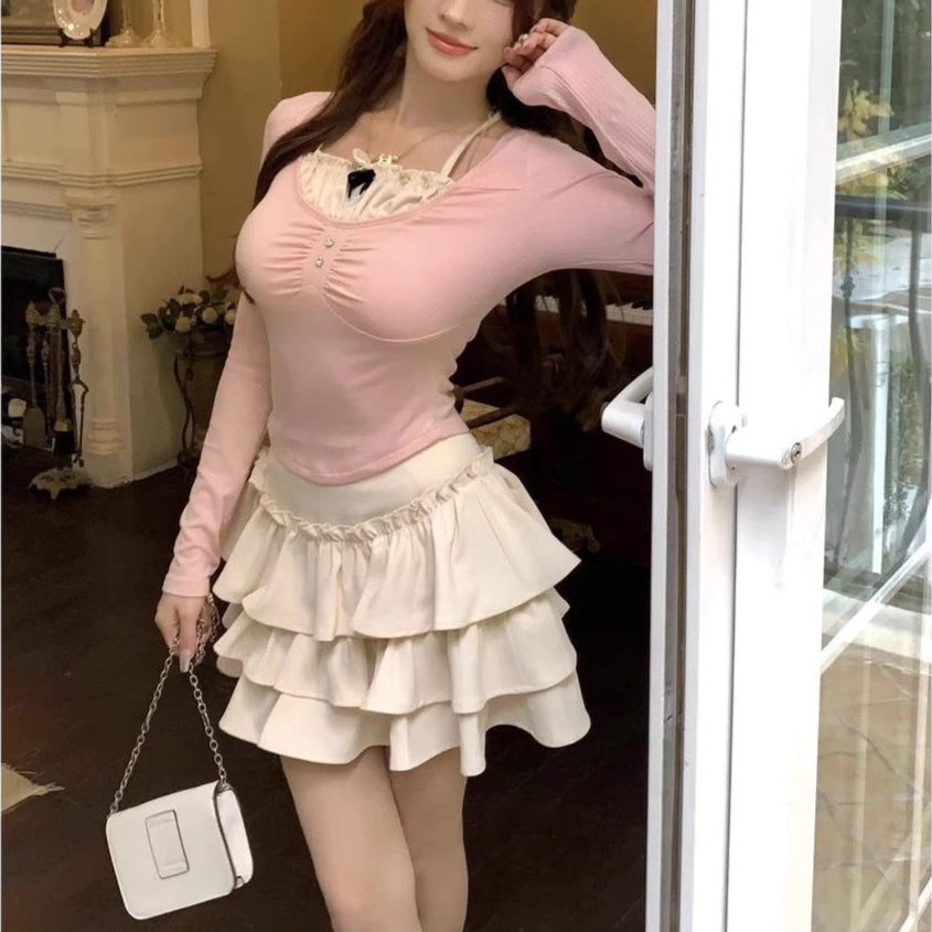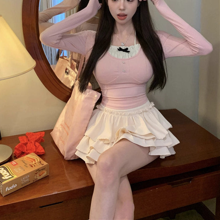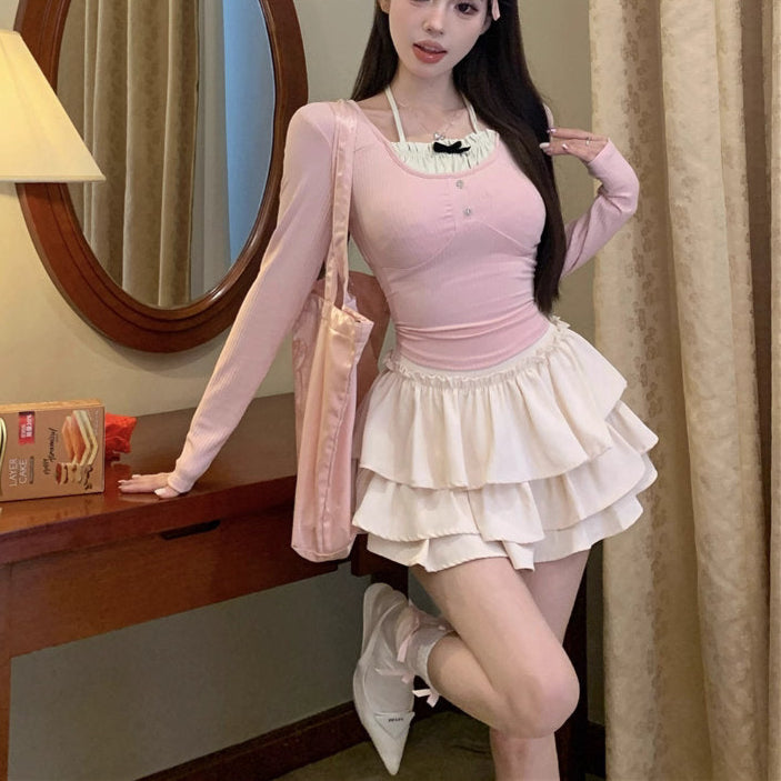 胸元のリボンとレースインナー風デザインが、クラシカルでロマンティックな