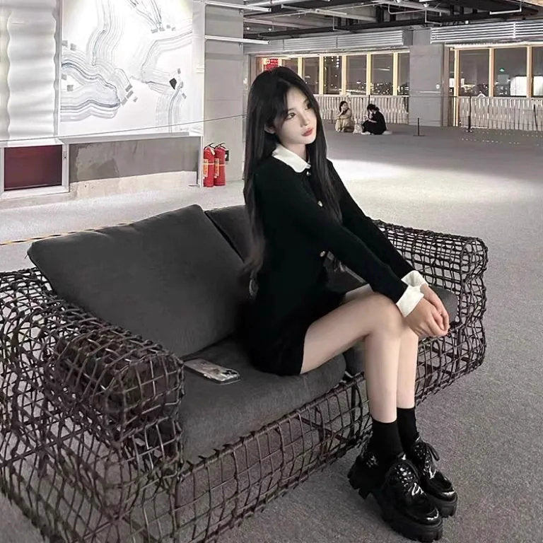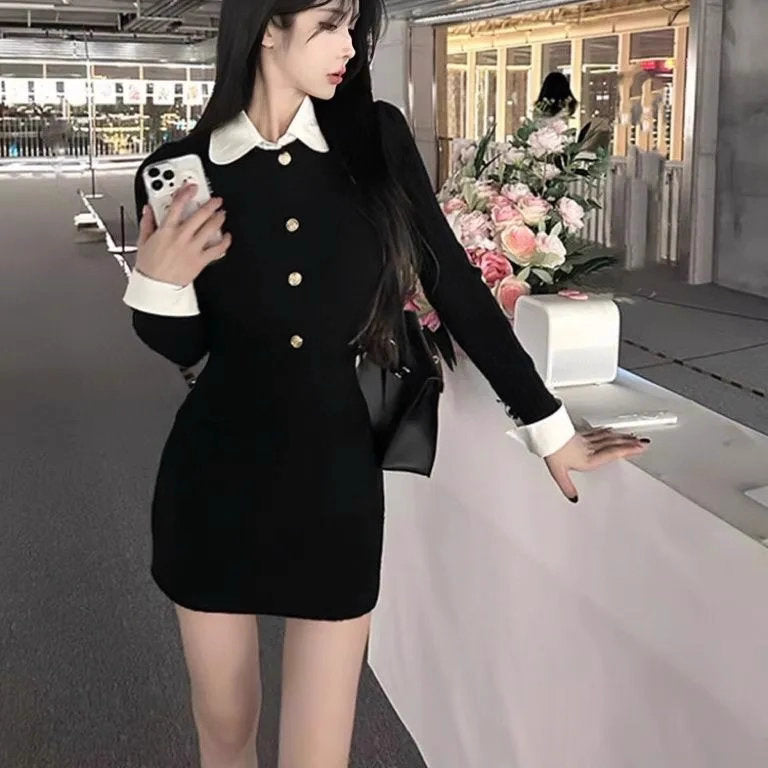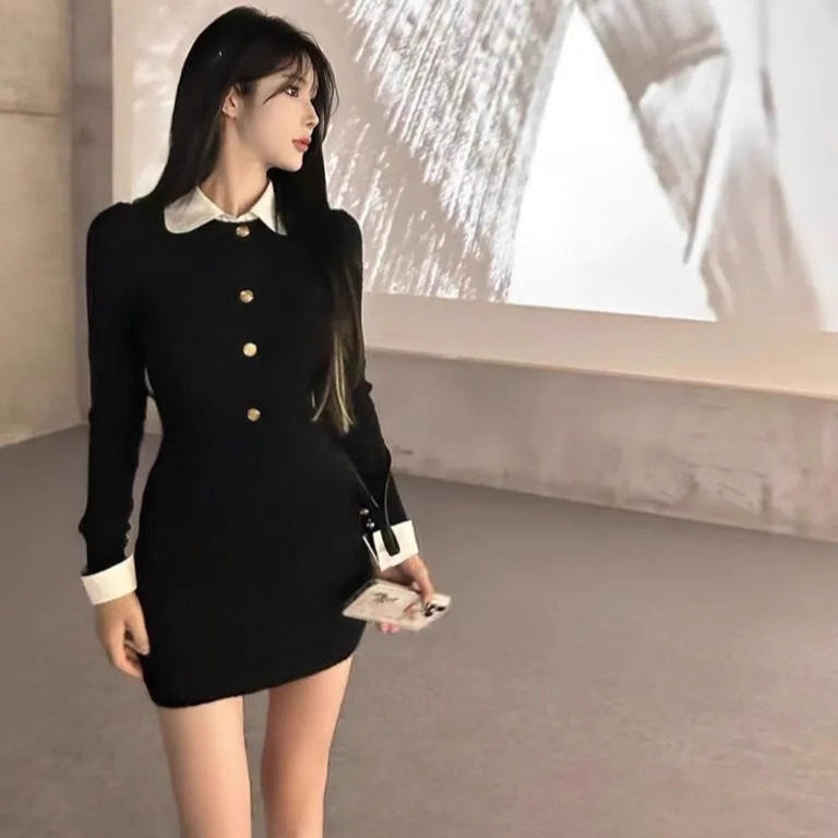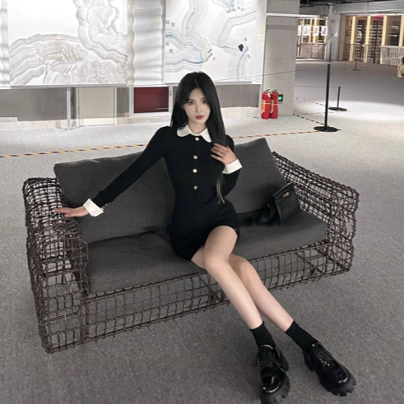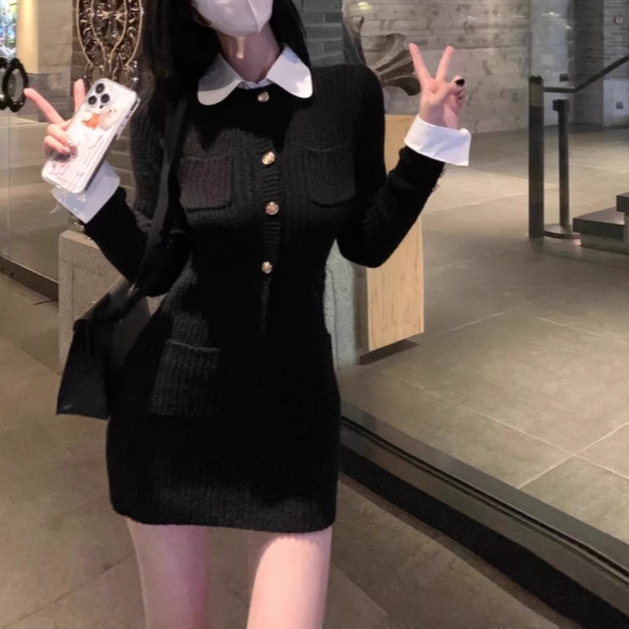 白襟とカフスがクラシカルなアクセントとなったブラックニットワンピース♡