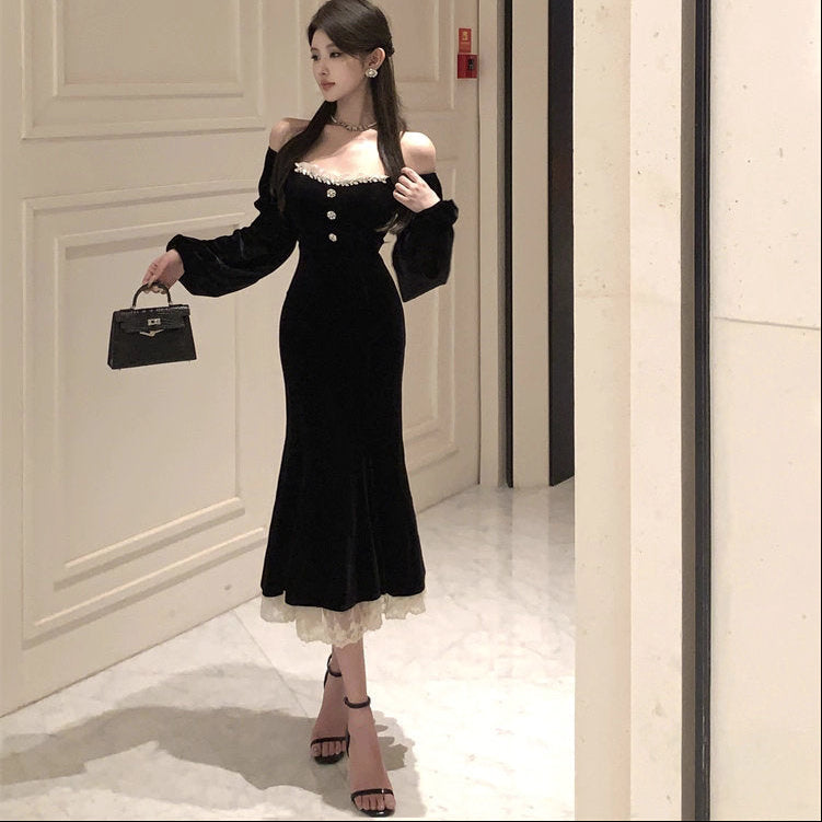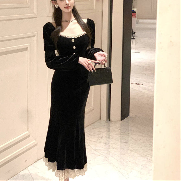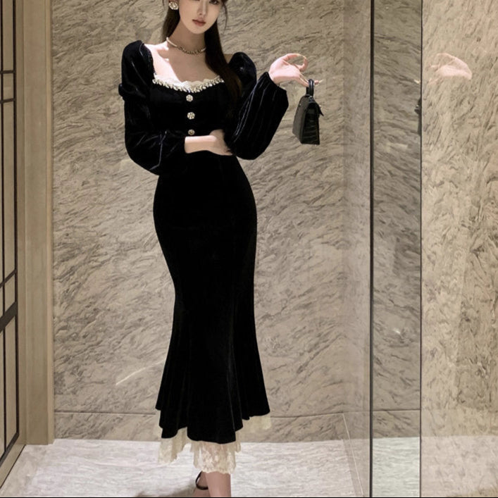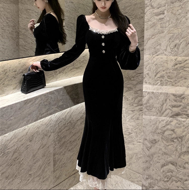 舞踏会で視線を集めるベルベットマーメイドワンピース_R0333