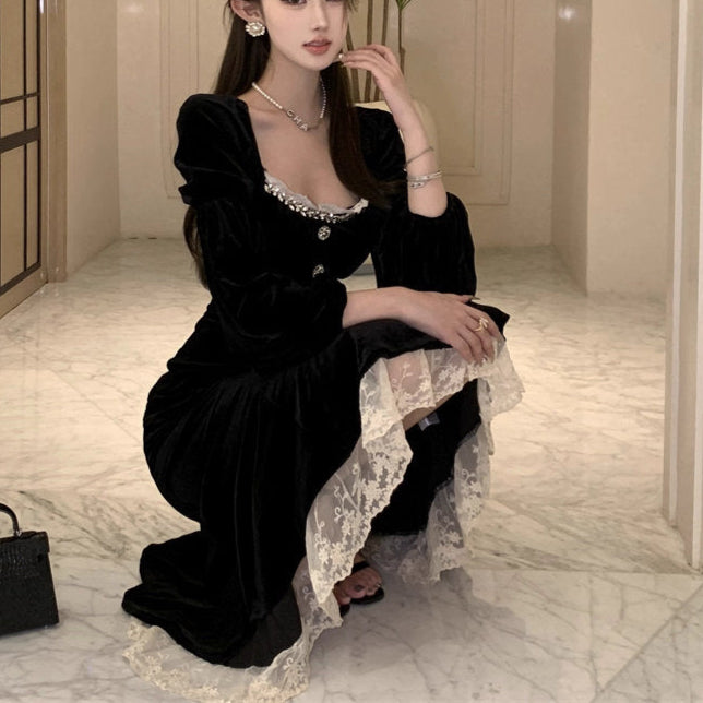 胸元のパールボタンとレーストリミングが映えるロングワンピース♡