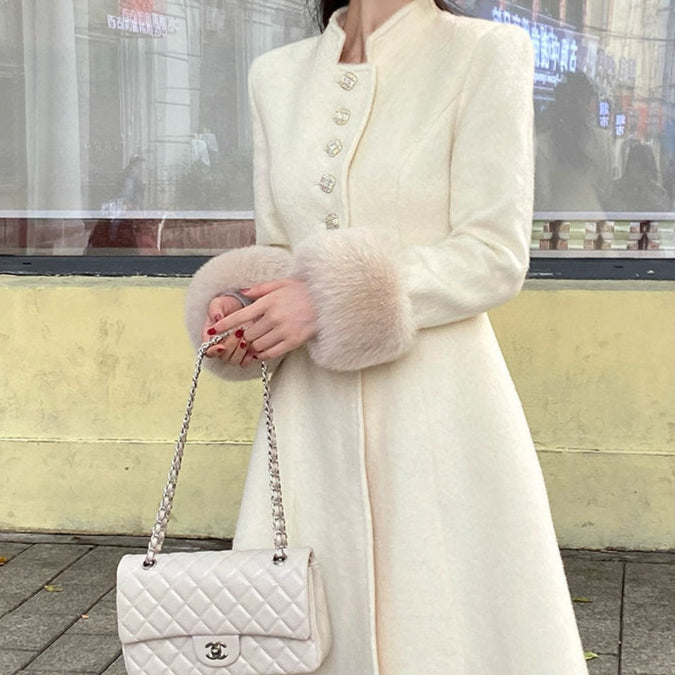 フェイクファーを袖口にあしらった上品でクラシカルなロングコート♡