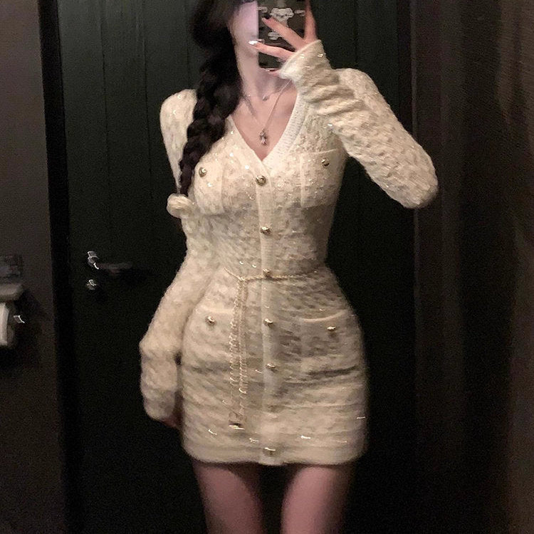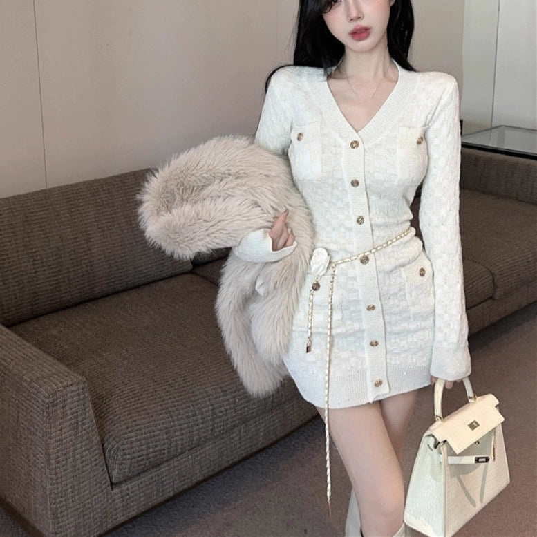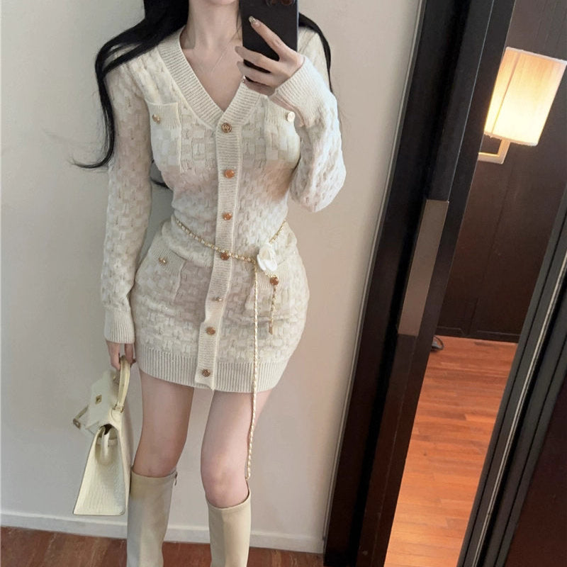 全体に施された立体感のある編地と、ゴールドのボタンが華やかさを演出♡