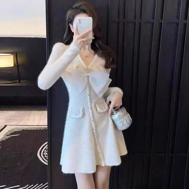 ふんわりと広がるシルエットに、大きなリボンとパールボタンをあしらった