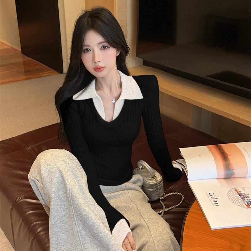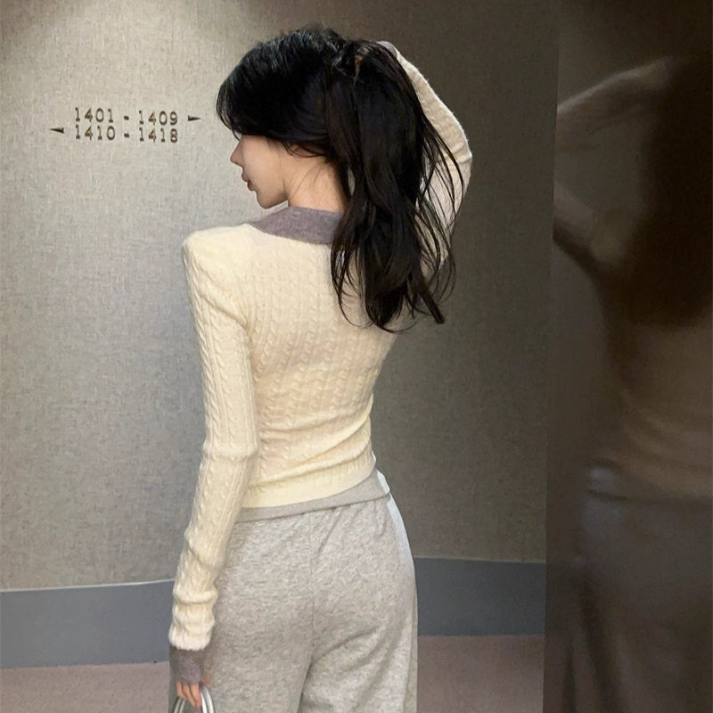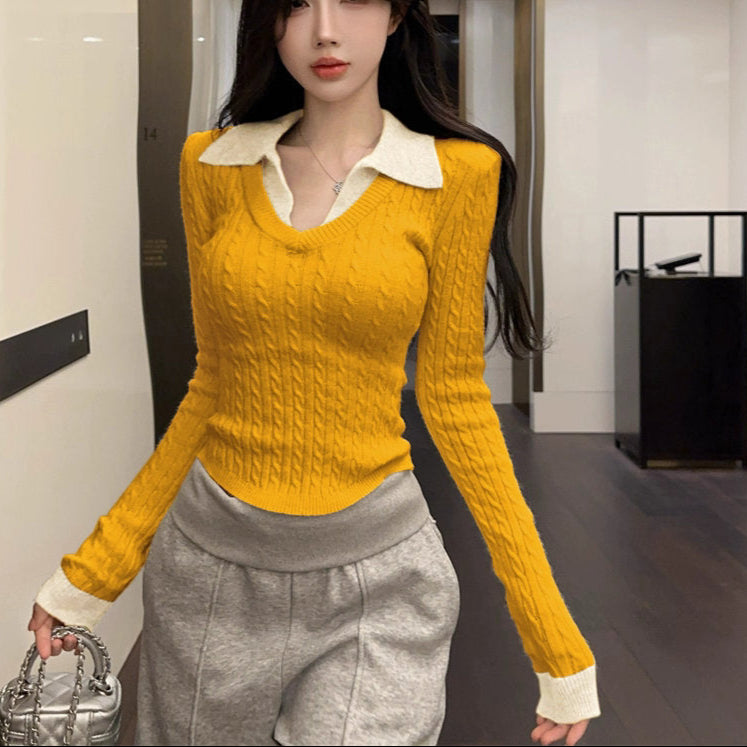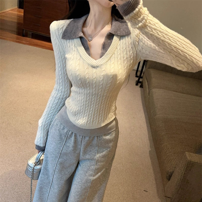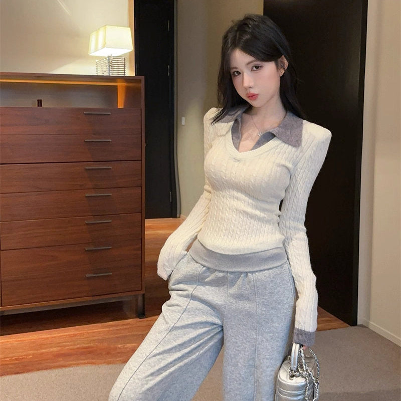 夜の街で視線を集めるシャツカラードッキングケーブルニット_R0361