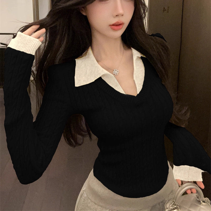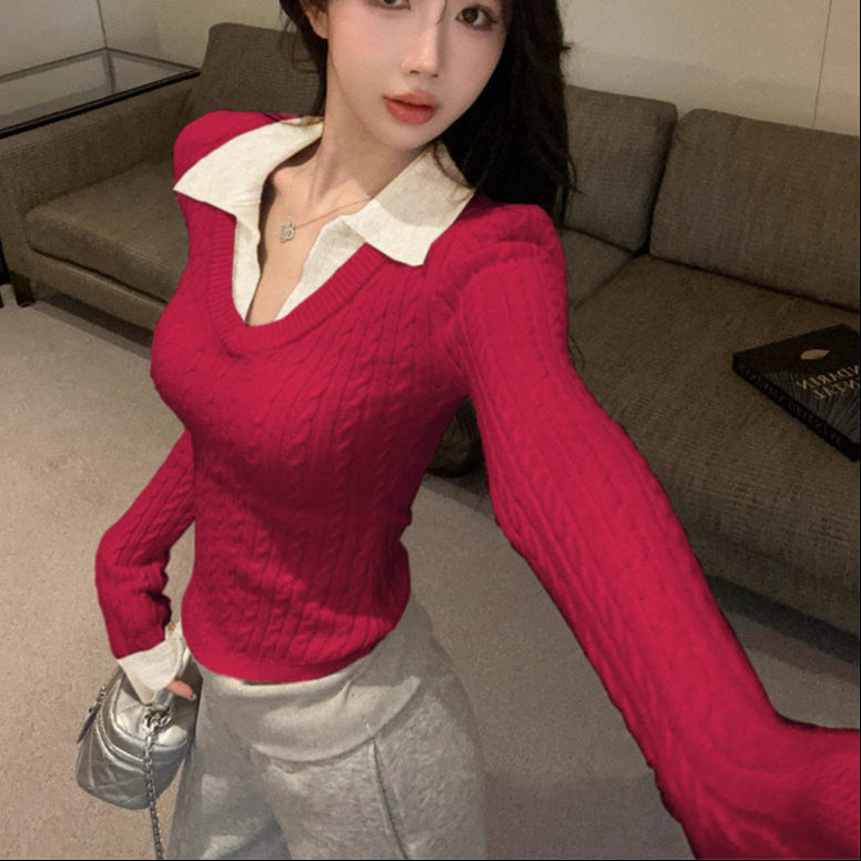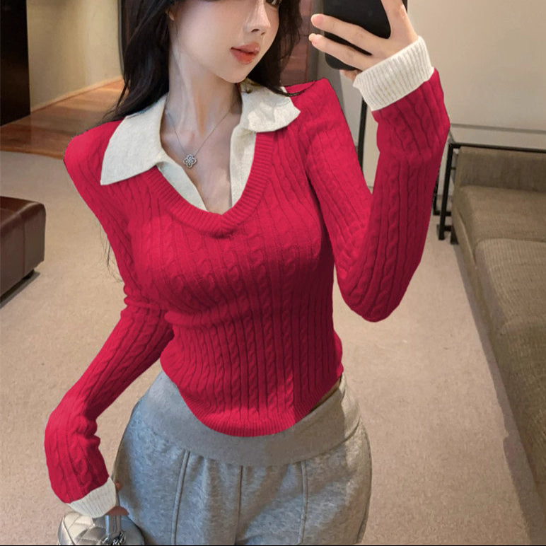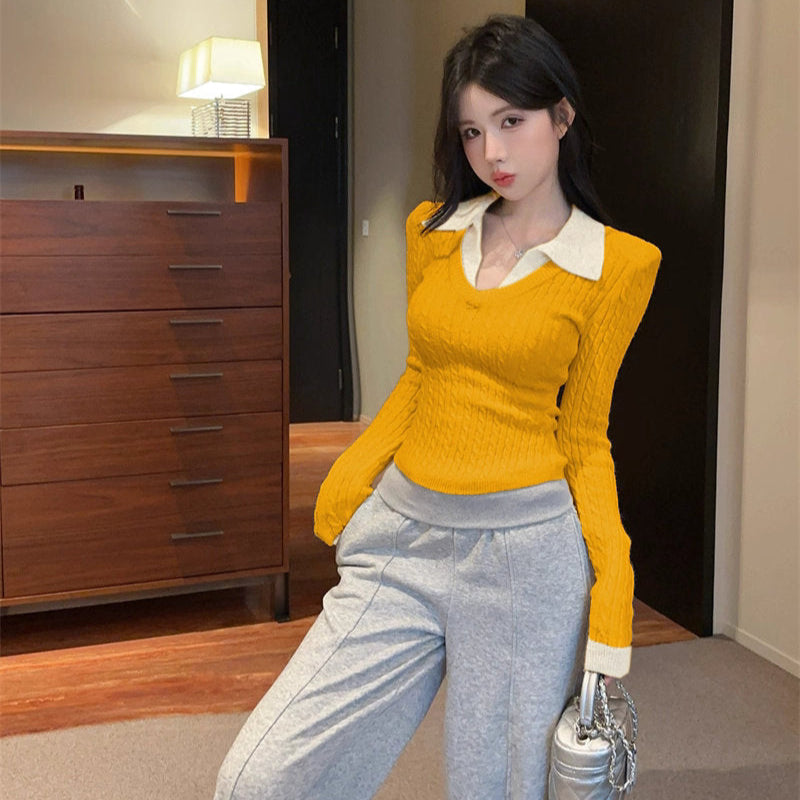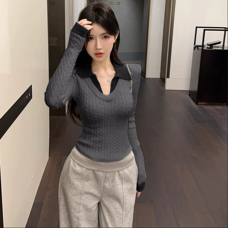 夜の街で視線を集めるシャツカラードッキングケーブルニット_R0361