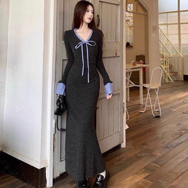 静かな美術館の廊下を歩くクラシカルロングワンピース_R0363