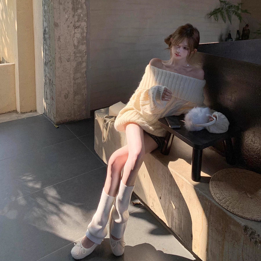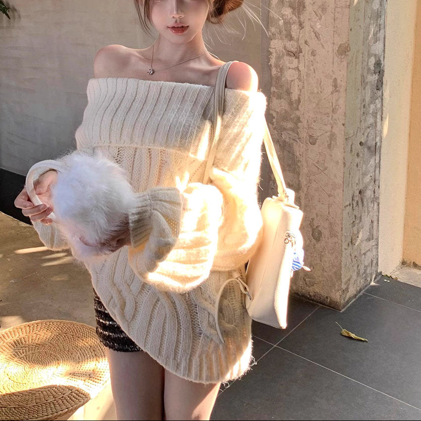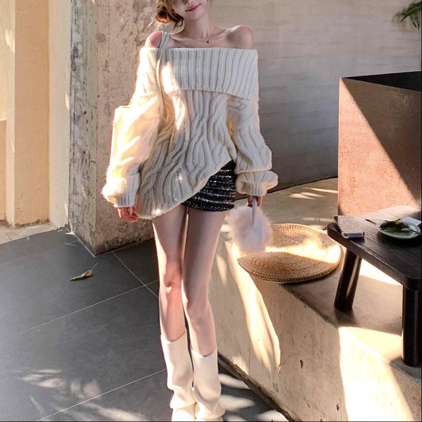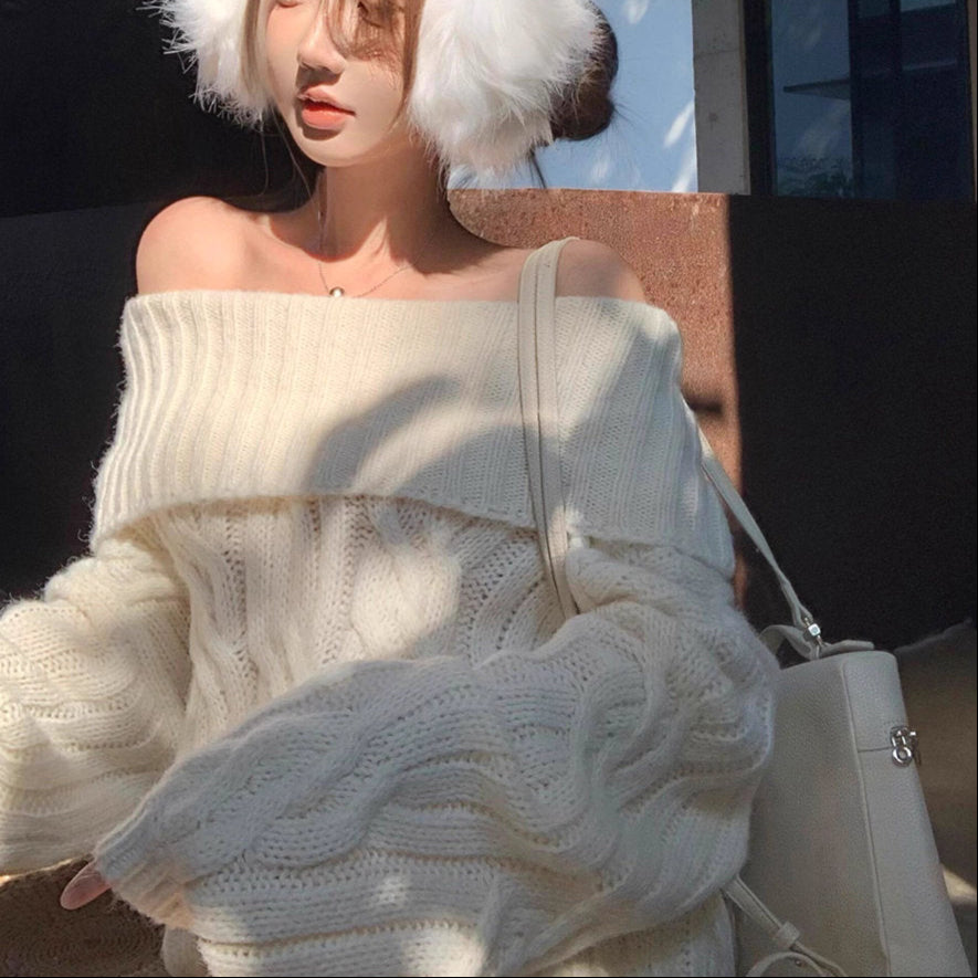 ホットチョコレートの甘さに似合う冬のオフショルダーケーブルニット_R0367