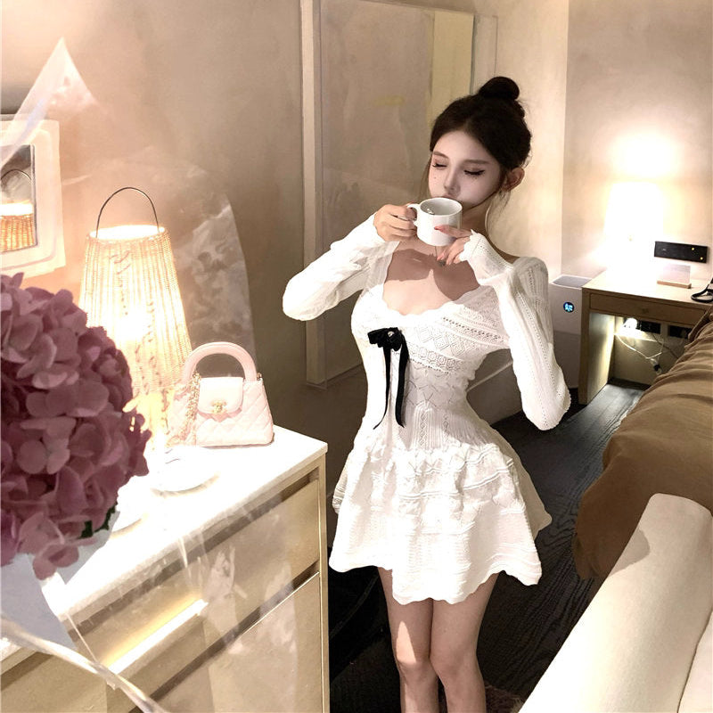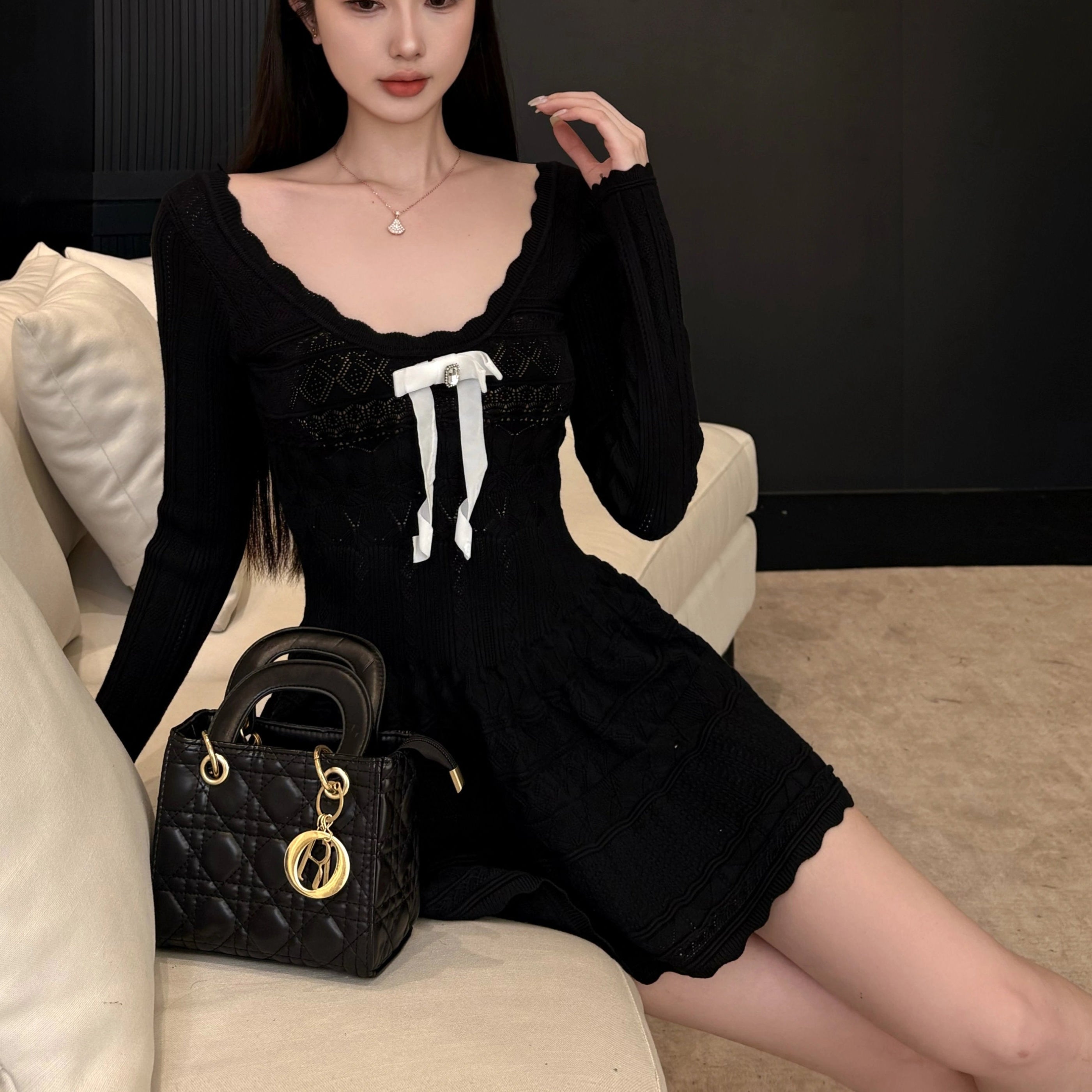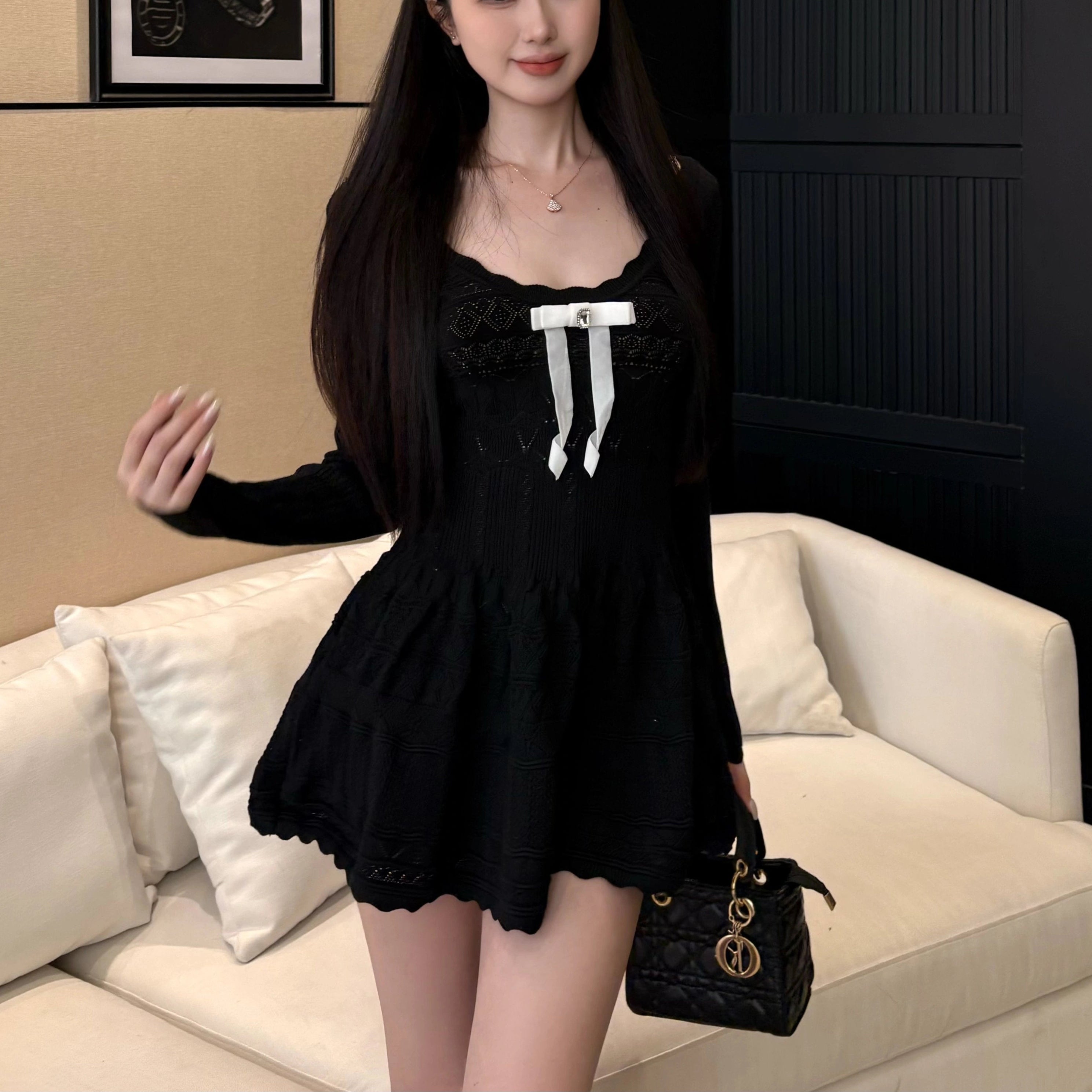 繊細なレース調デザインに胸元のブラックリボンを添えた