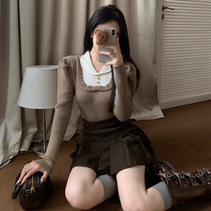 白い襟を揺らして恋を待つスクエアニットトップス_R0416