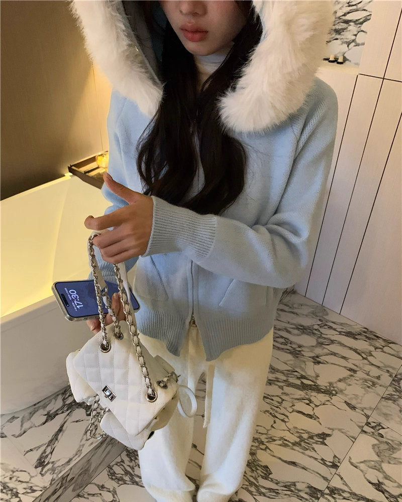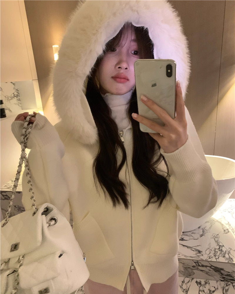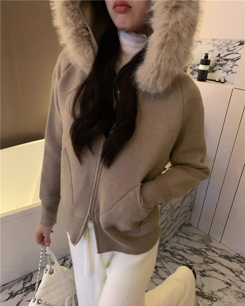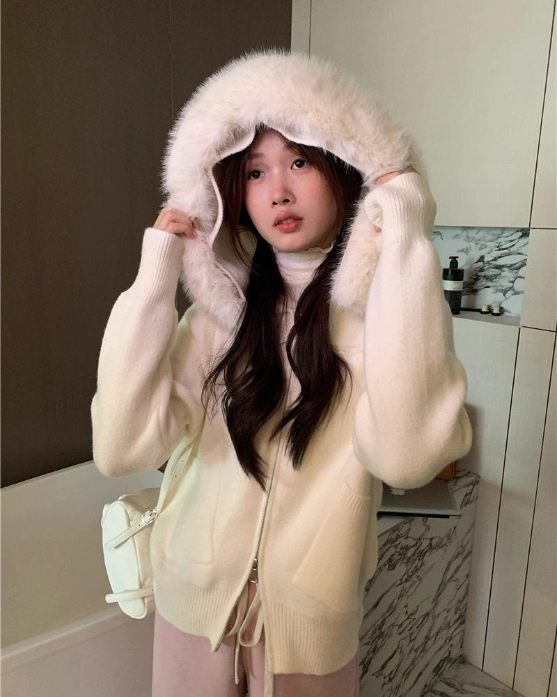 冬の朝に恋をする少女のファーフードニットカーディガン_R0419