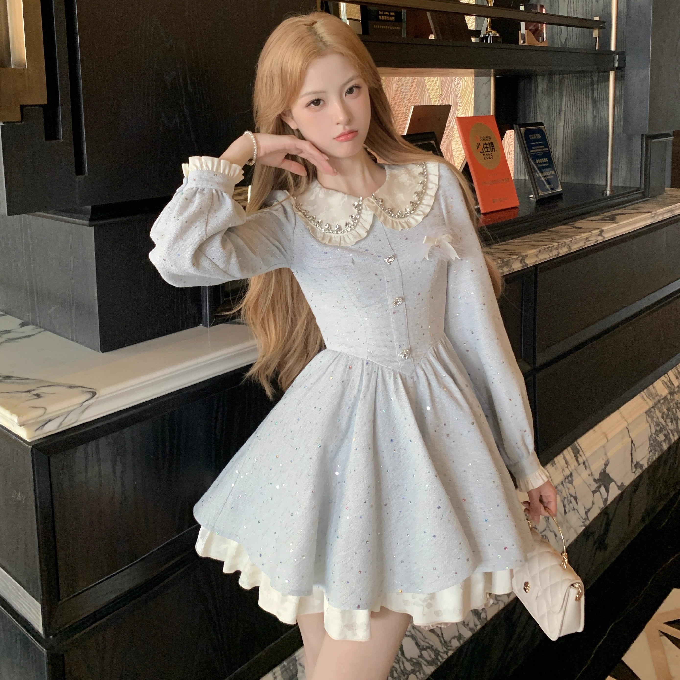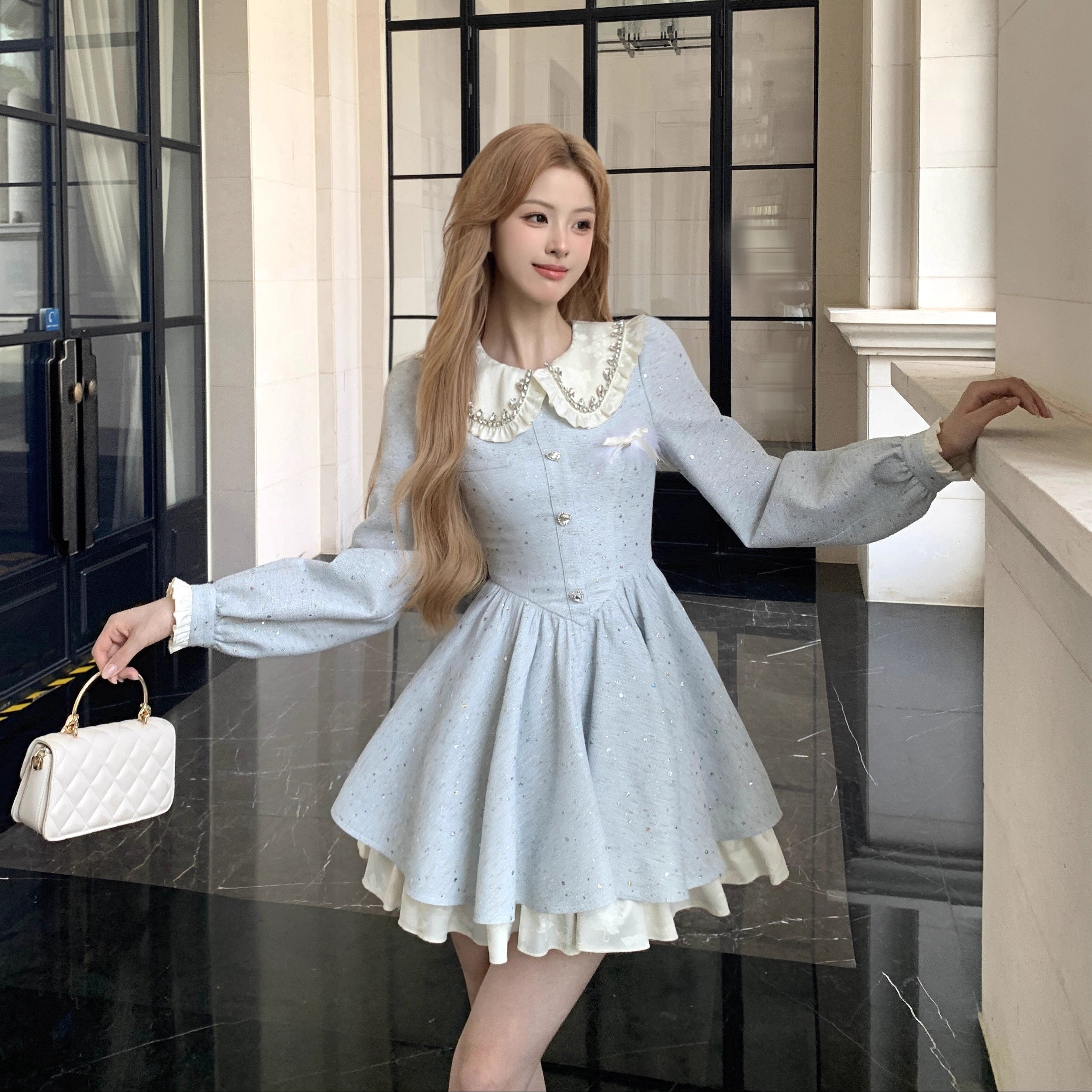 パールボタンやフリル襟が上品で、