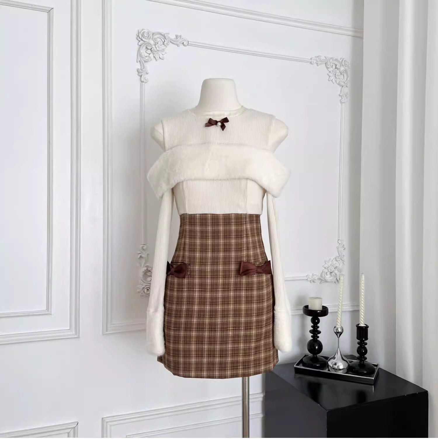 ニット×チェックのドッキングデザインが可愛いワンピース。