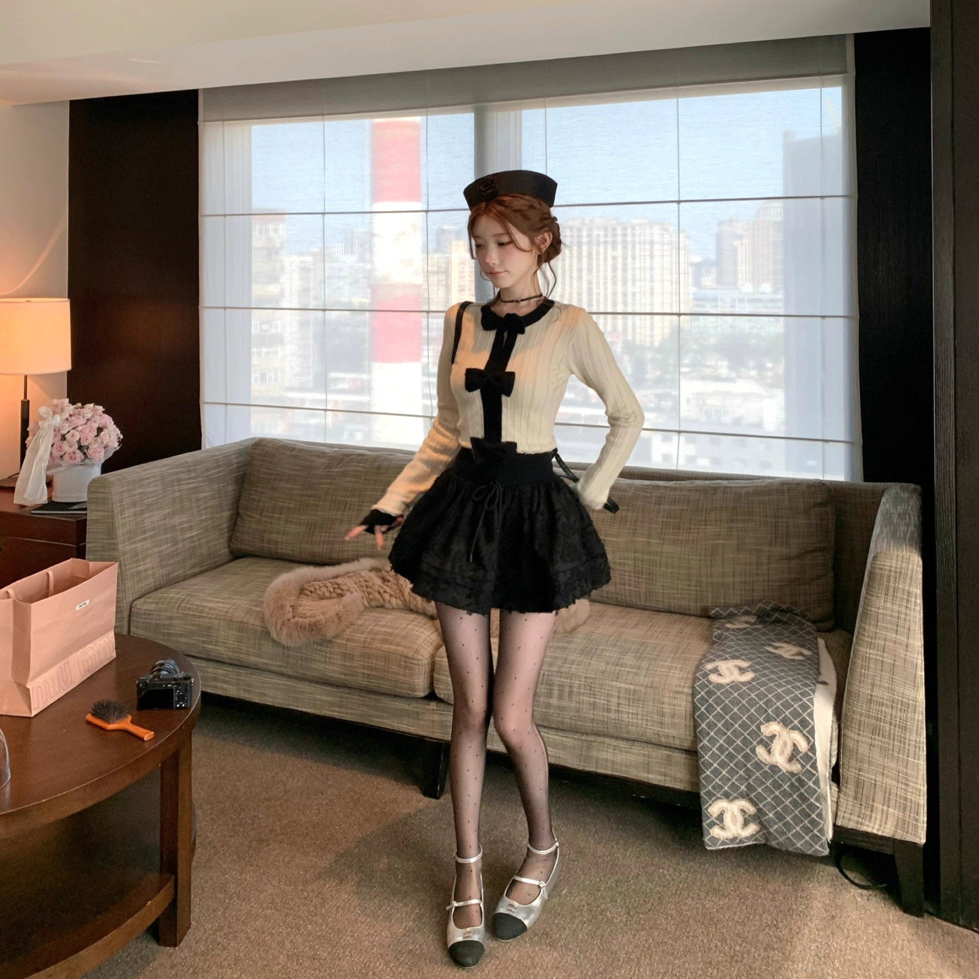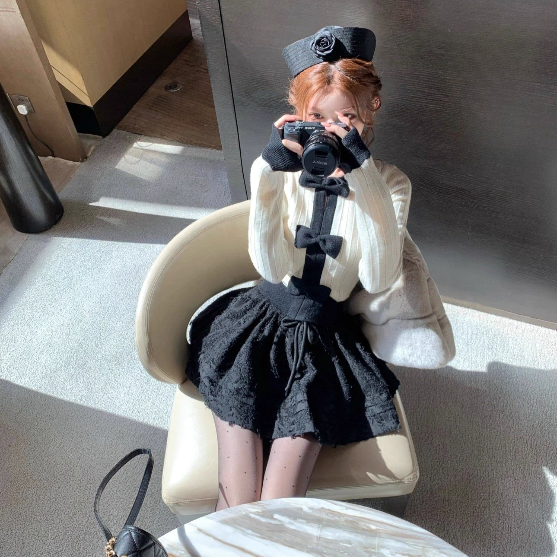 お気に入りのカフェでホットチョコを飲む日のリボンケープニット_R0376